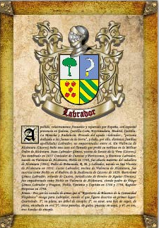 | Ahora les voy hablar acerca del escudo LABRADOR, es impoprtante entender que los escudos no pertencen a los apellidos como tal, sino a las personas y las familias (tambien las instituciones), las que adoptan o heredan un blasón. Es decir, no todos los LABRADOR tienen el mismo escudo, ya que existen el mismo apellido con diferentes origenes. | |